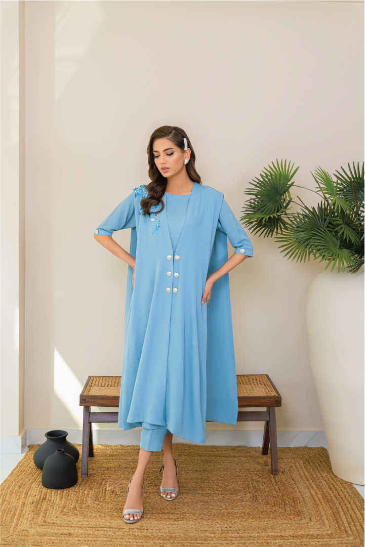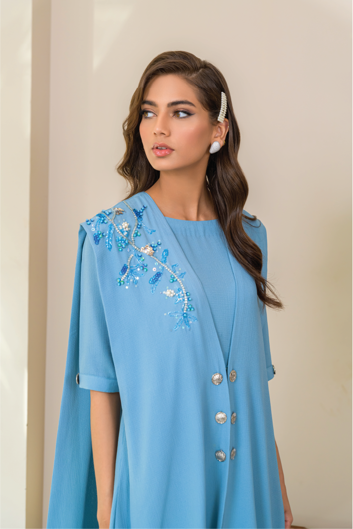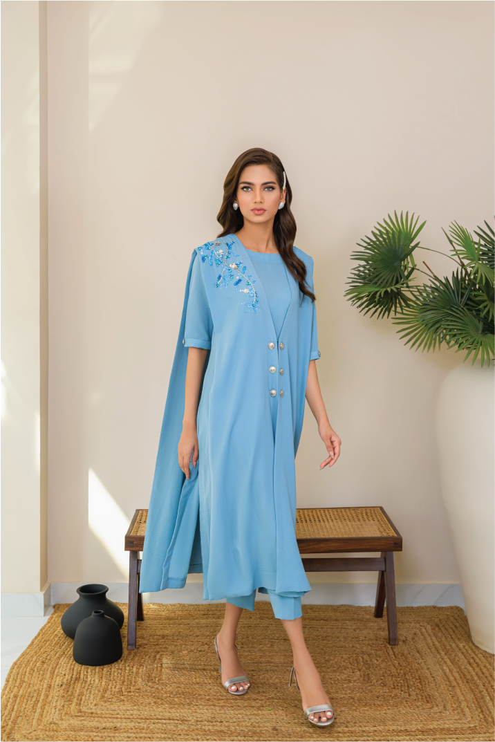 Crafted from textured georgette, this ensemble is a stunning two-layered outfit with unique sequins and stone work on one side. Its stylish cut offering a blend of elegance and modern flair.