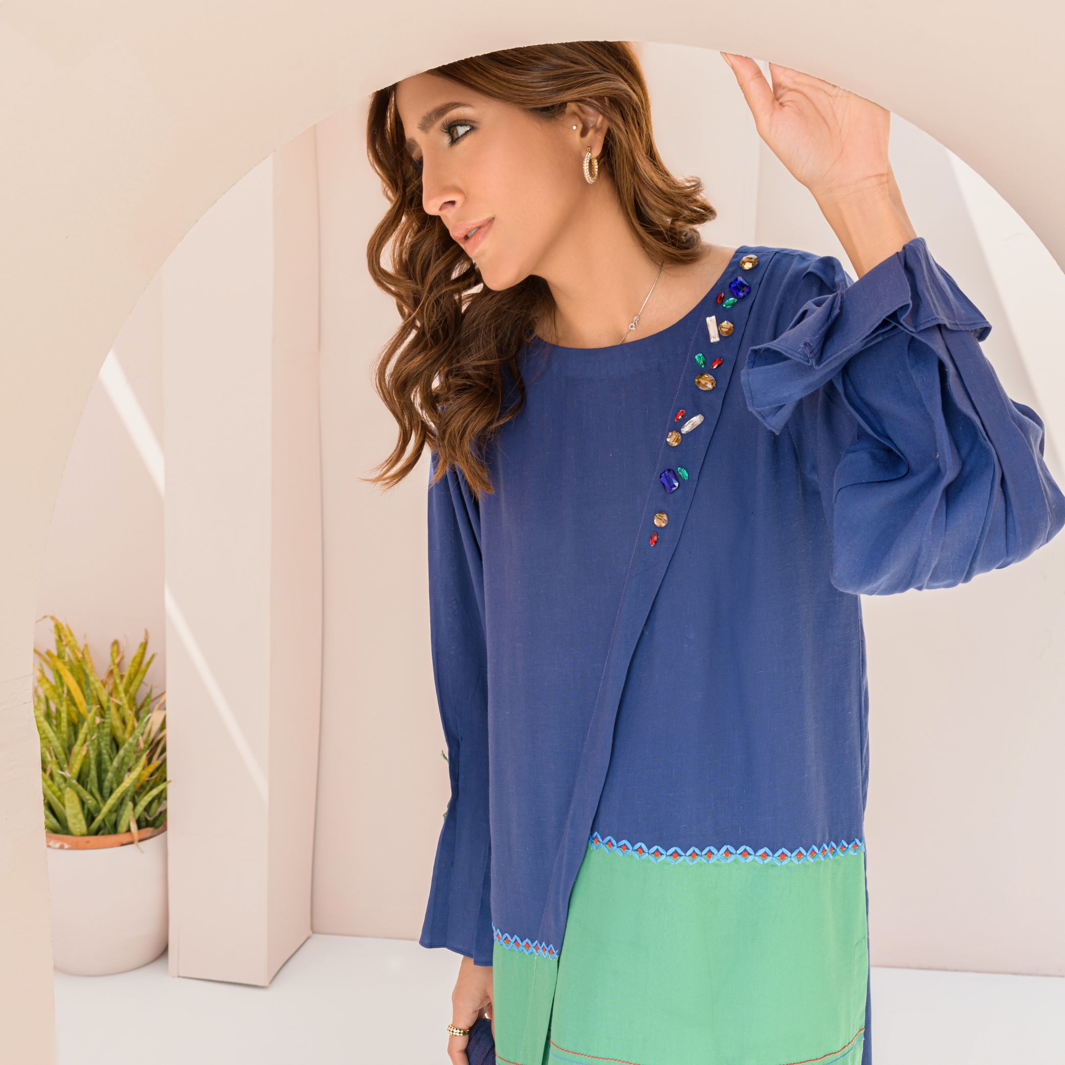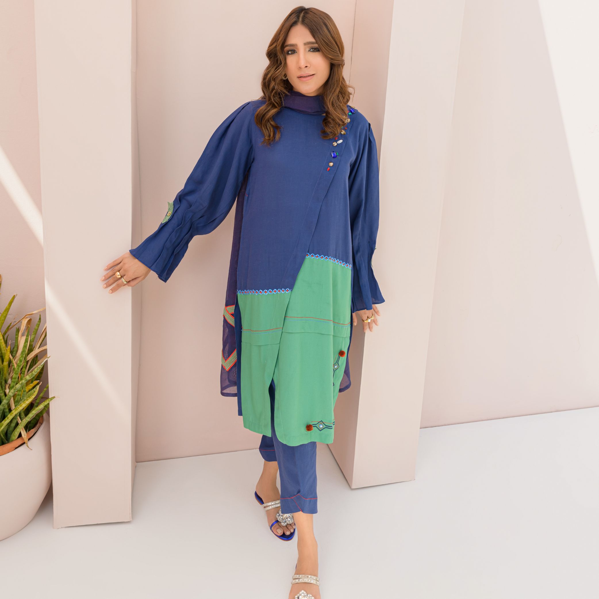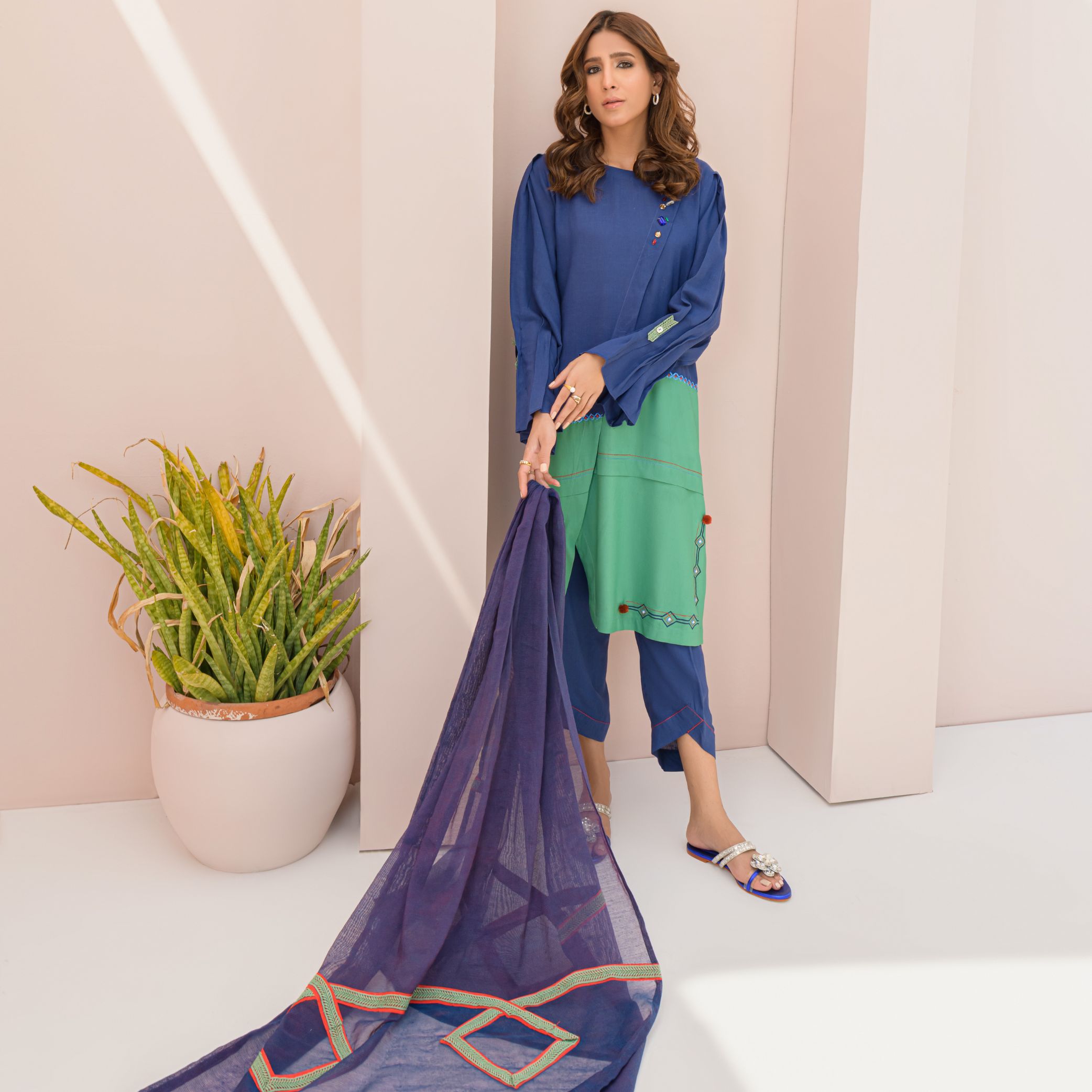 Look every inch Chic in Cyan from our Latest Collection, that is Modishly made on Breathable Irish Cotton in 2 Color Contrast. The Outfit comes with machine embroidery on one side of shirt’s daaman and front. Neck is creatively designed with Stone Work. Khaddi Net Dupatta gives an Elegant Finishing Touch to the Apparel.