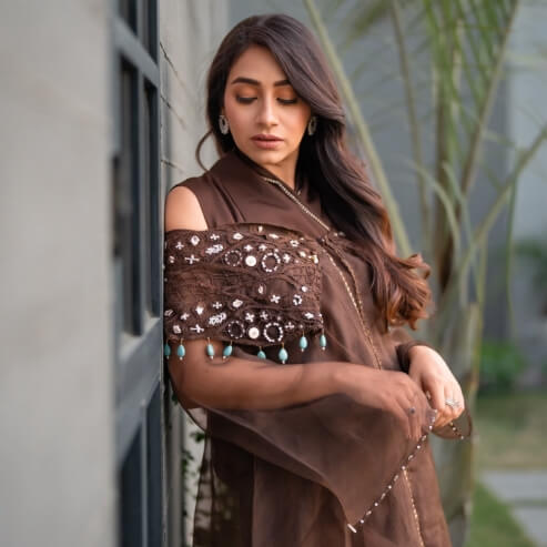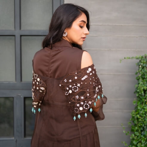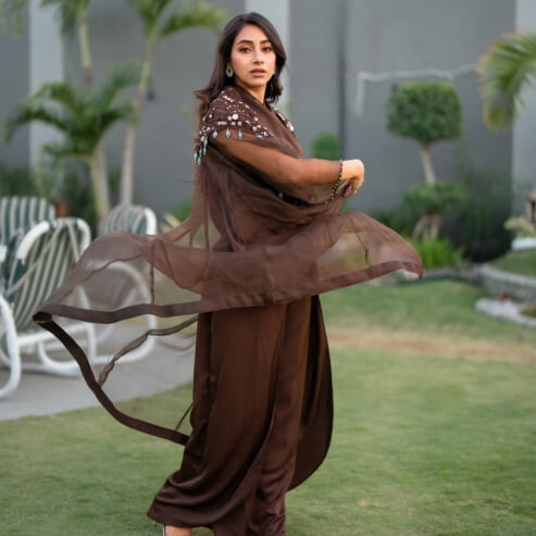 A fabulous 3-piece set featuring a high-neck inner/slip adorned with dazzling diamanté detailing. The upper/jacket, crafted from organza, boasts net fabric and distinctive hand embroidery on both shoulders. The pants are designed with a flared silhouette and a chic tulip cut, completing this ensemble with flair and elegance.