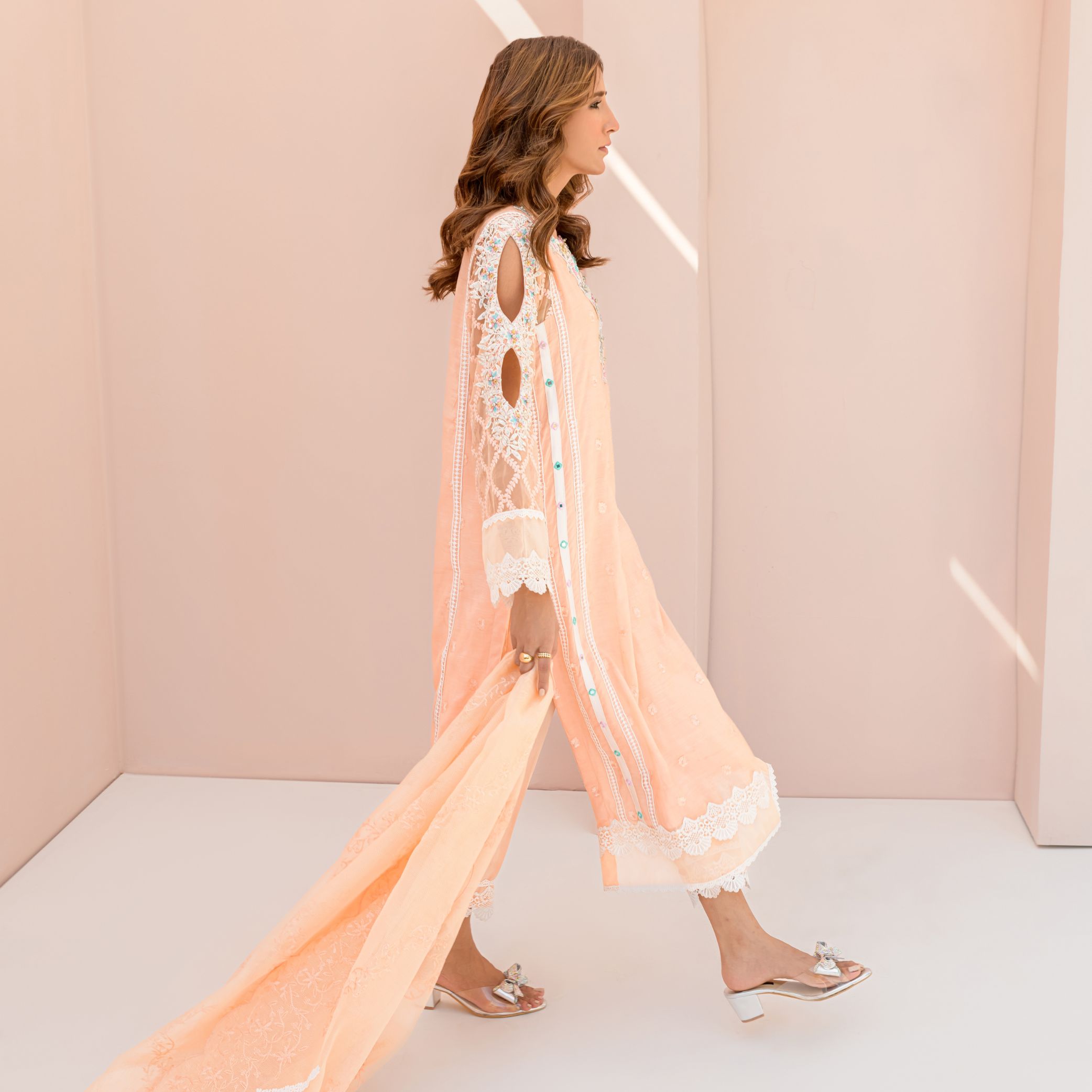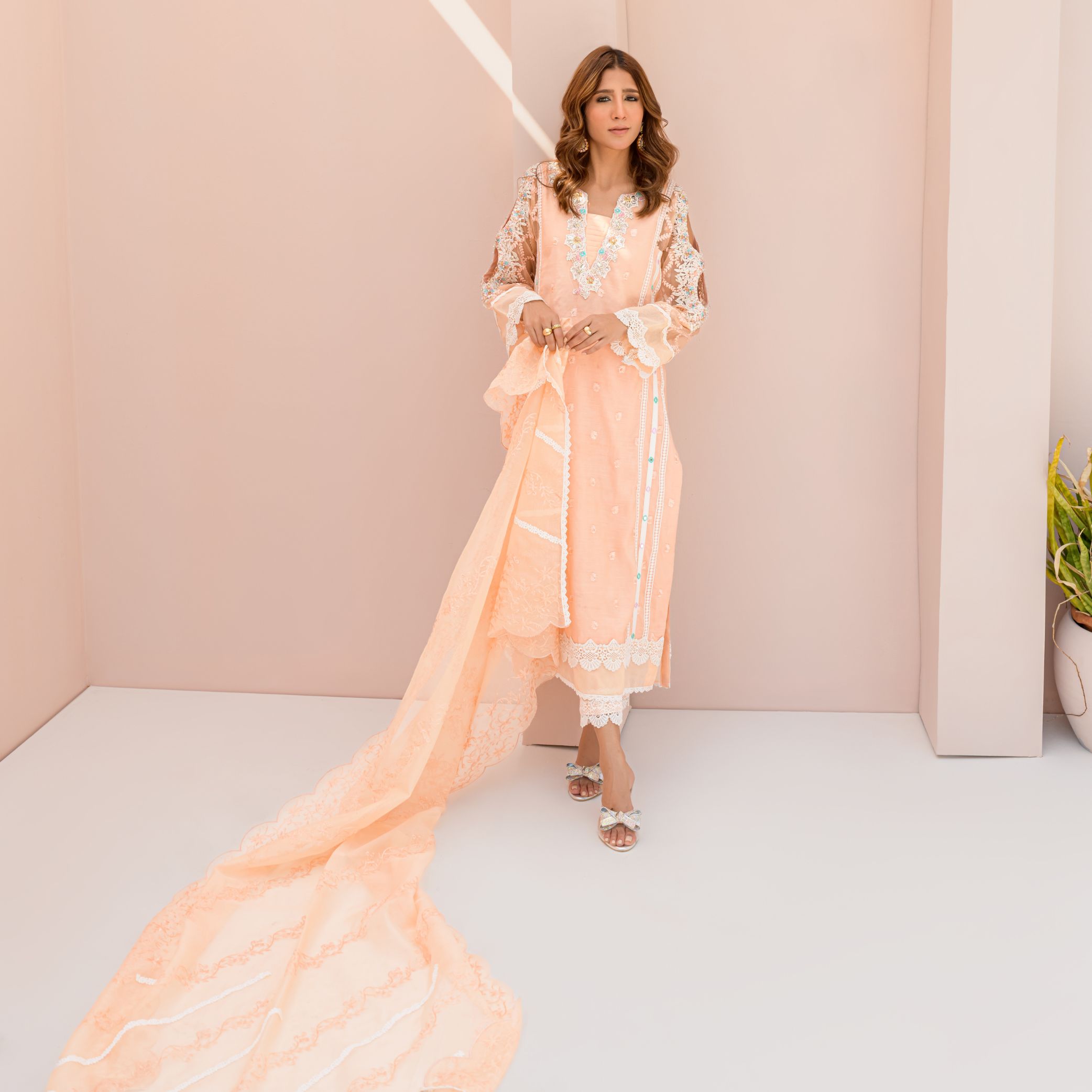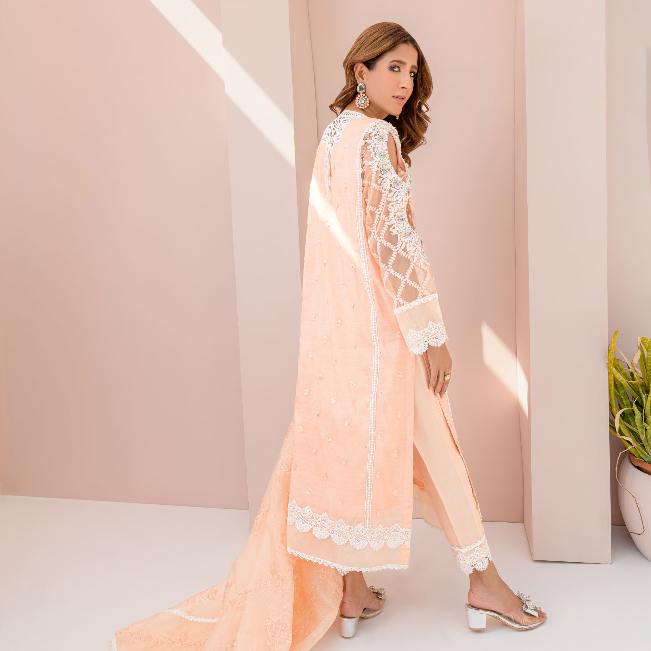 Fiore is one of the finest Attire from our Semi Luxury Collection. It is a Creative Fusion of Handwork and Laces. The delicate stones and dabka Handwork on Neck and Sleeves makes the dress Extra Special. The front is adorned with Mirror work lines and the back has Fine Lace Detailings and a handmade Tussel. The Outfit comes with an Embroidered and Scalloped Dupatta with Lace Detailings as an Elegant touch up.