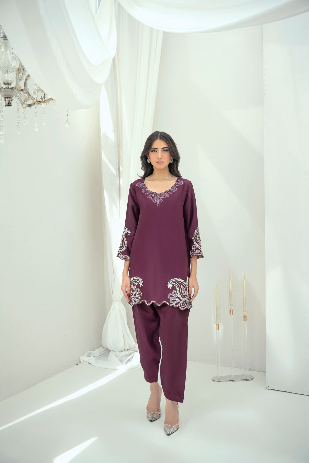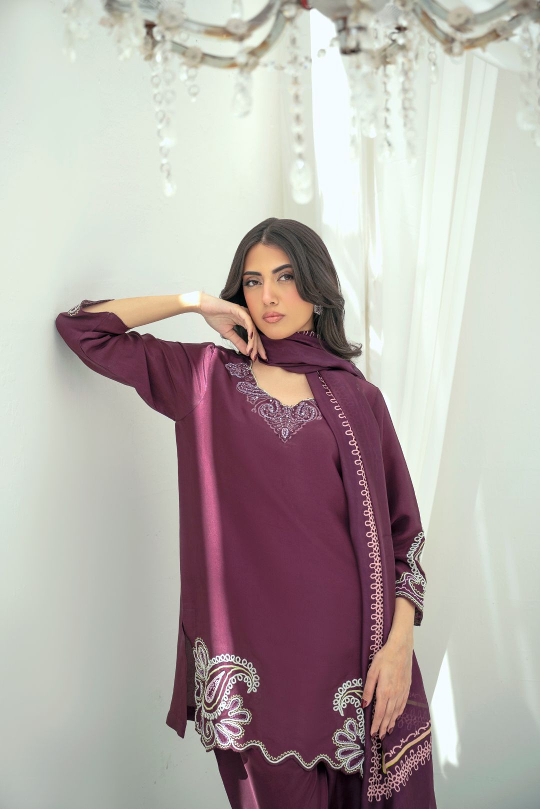 Inara is made in luxurious butter silk, offering a smooth, fluid drape. The daaman is detailed with dori and handwork, while the neckline features refined embroidery for a polished finish. A separate block-printed dupatta adds a soft contrast, completing the look. This two-piece set (shirt and pants) is thoughtfully designed for Ramadan and Eid occasions, blending tradition with modern finesse. The dupatta is optional and can be purchased separately.