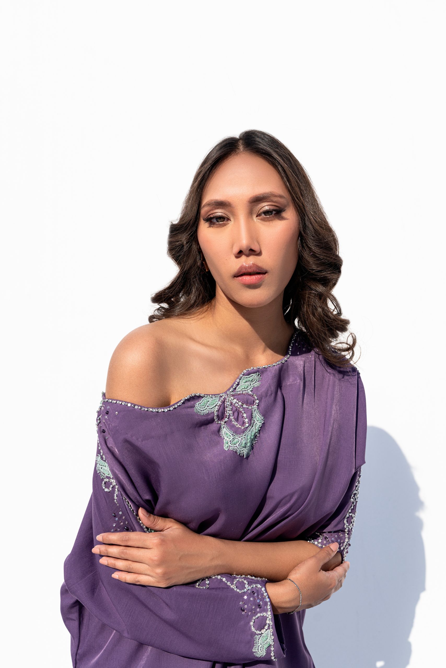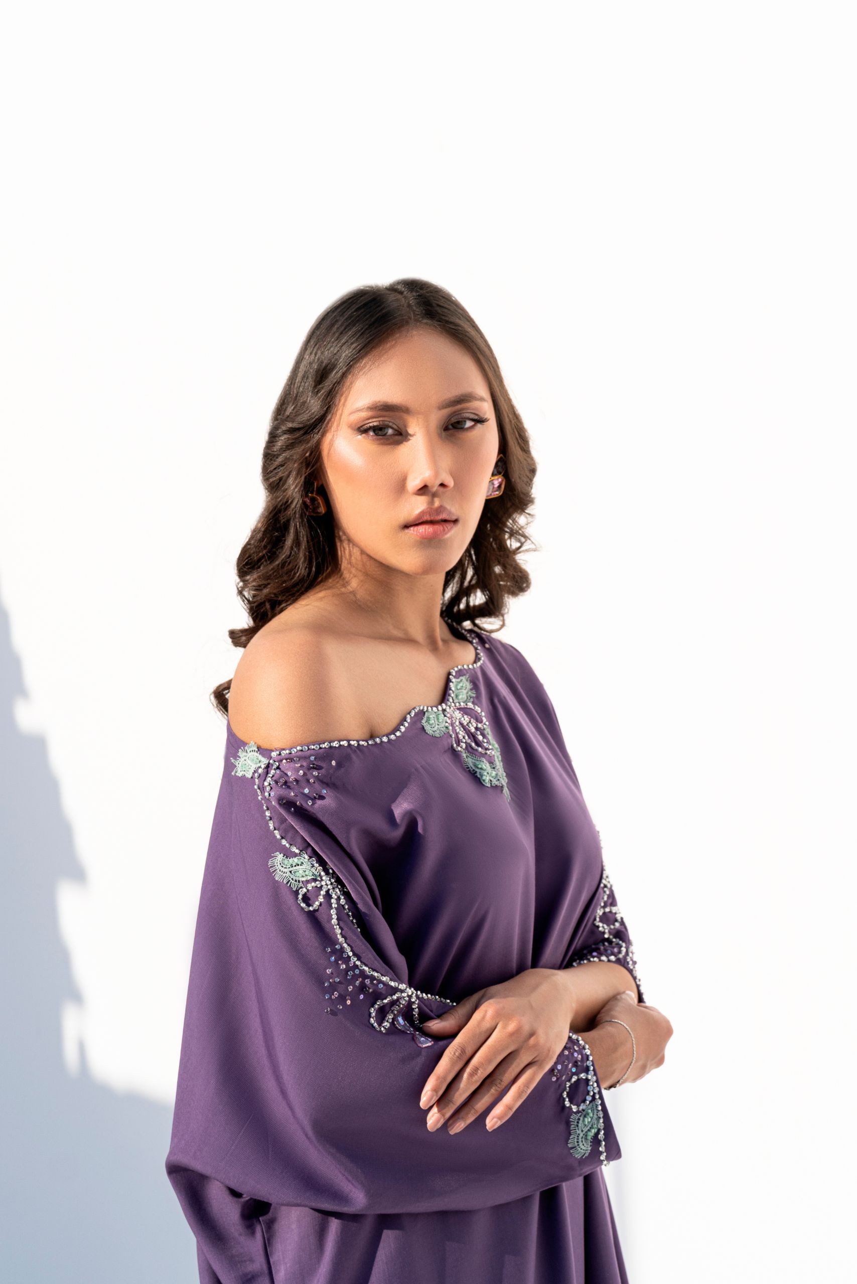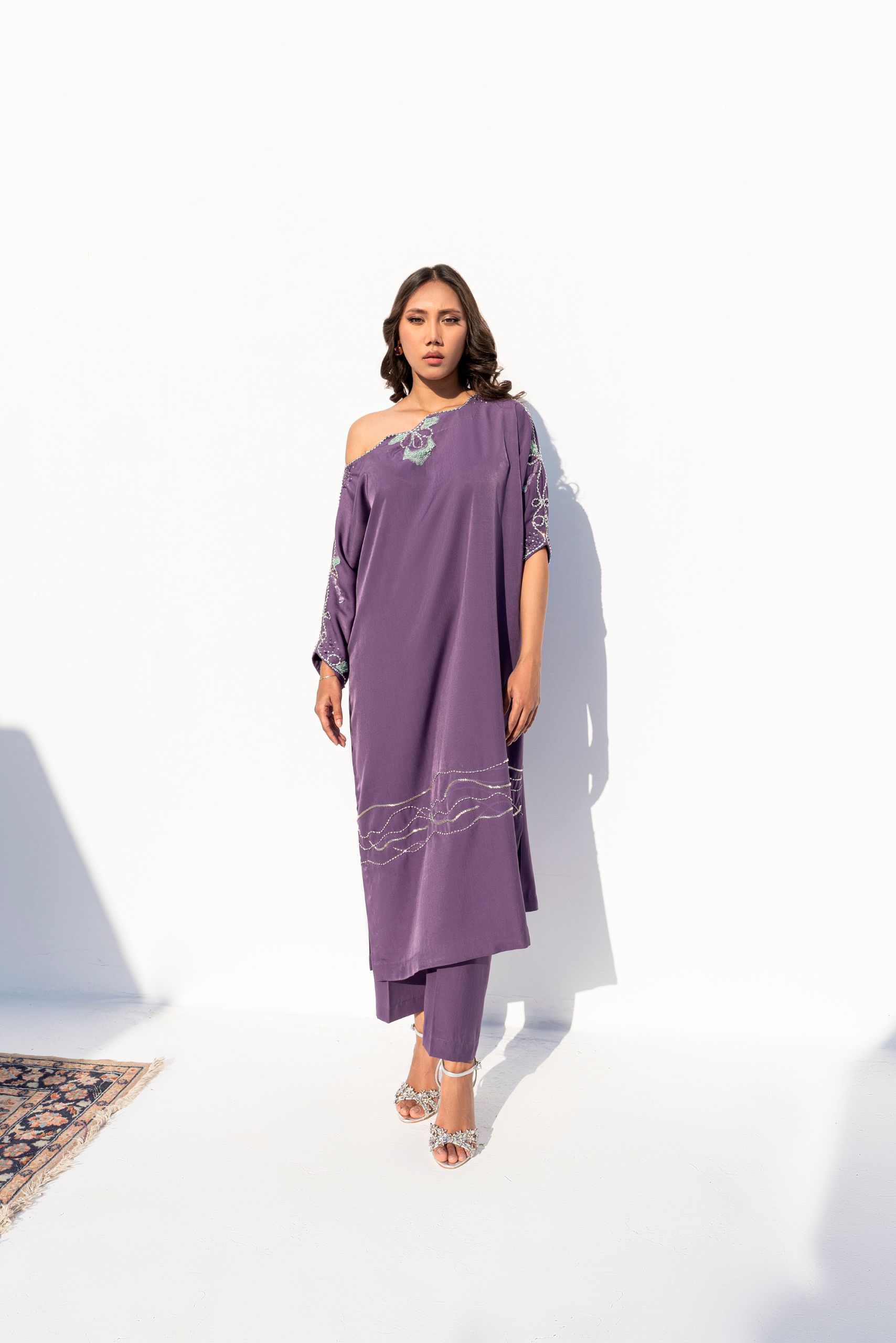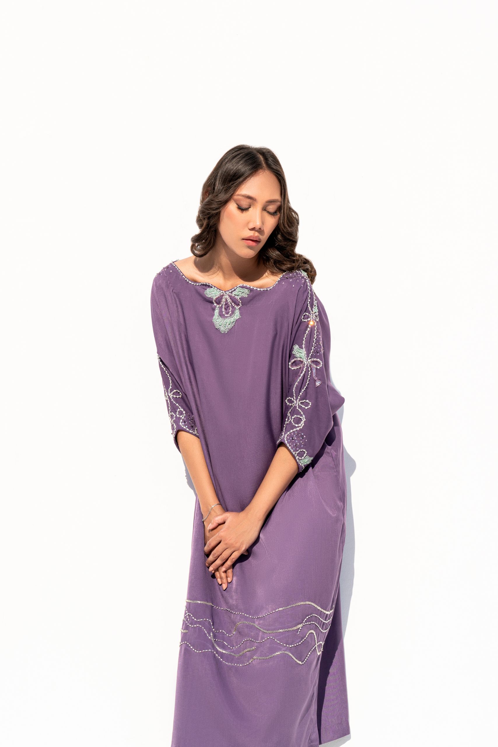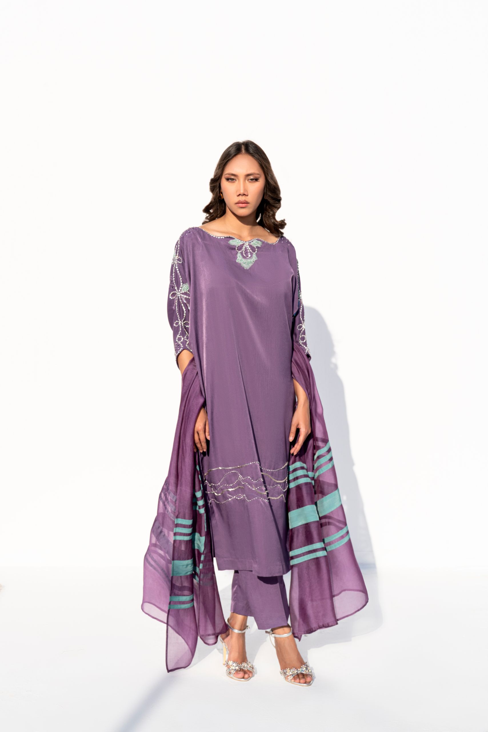 A silk masterpiece, the Moonlit dress features trendy bow-style embellishments on the sleeves and neckline. Handwork on the daman further enhances its charm, creating a sophisticated yet contemporary look.