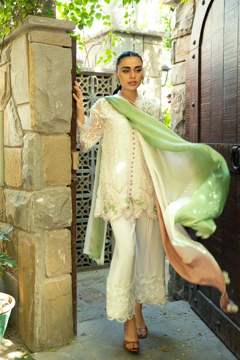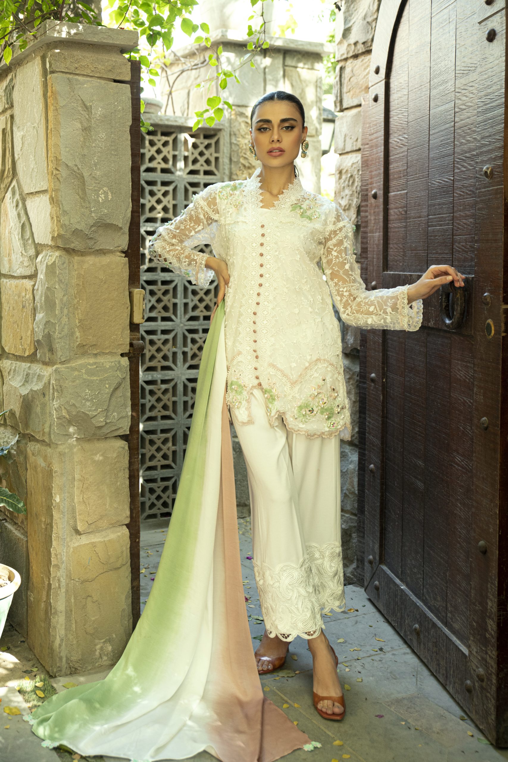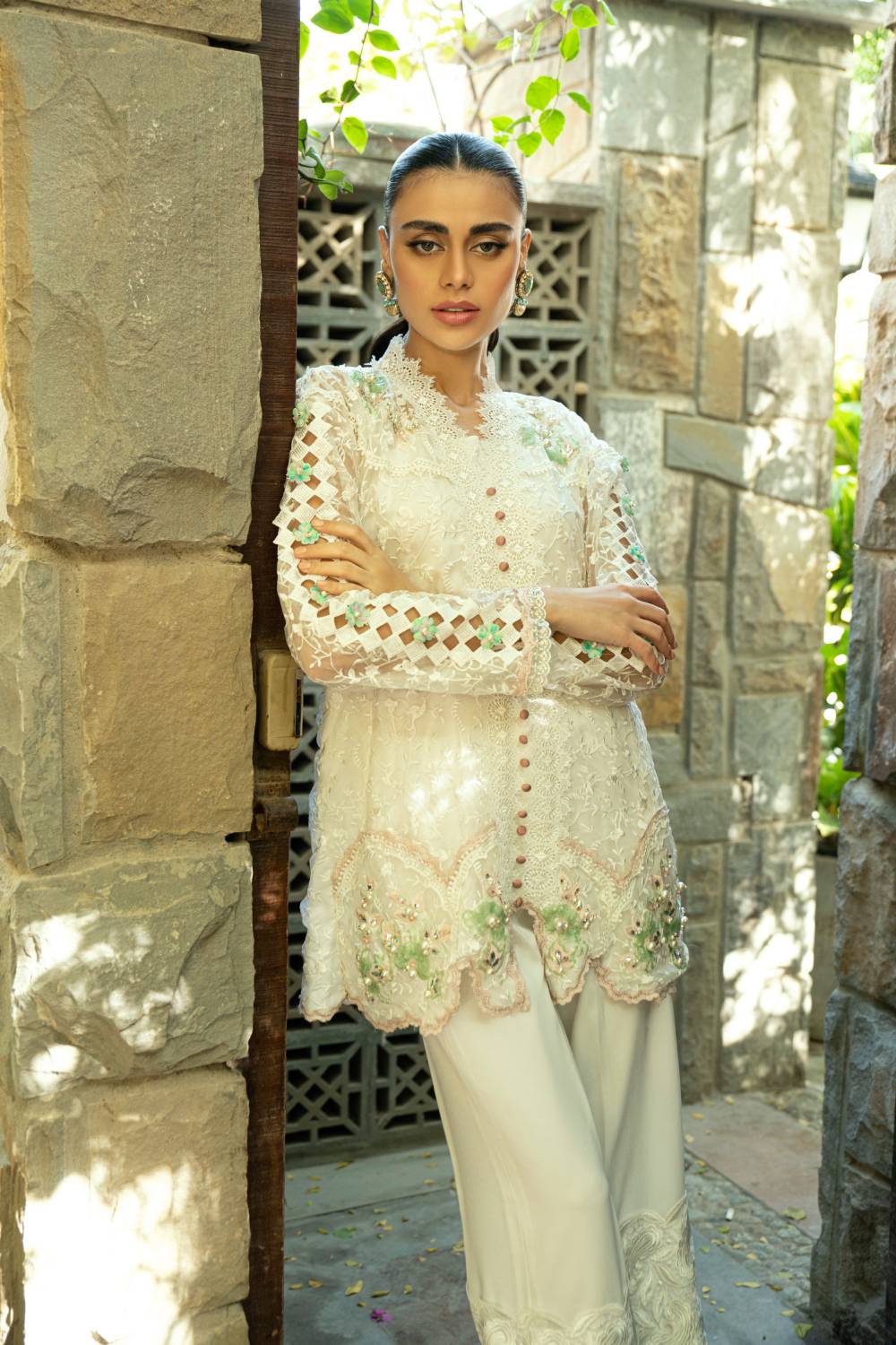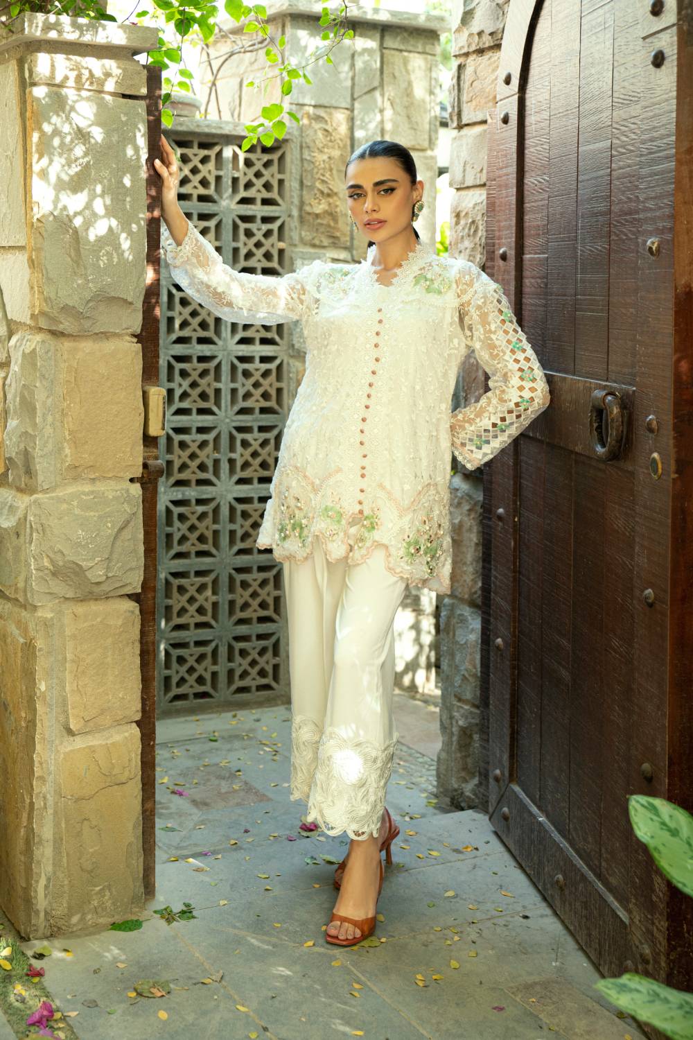 Exquisite opulence crafted in embroidered organza. Hand embellished with intricate lace detailing, this shirt exudes charm and elegance. Perfect for festive occasions.