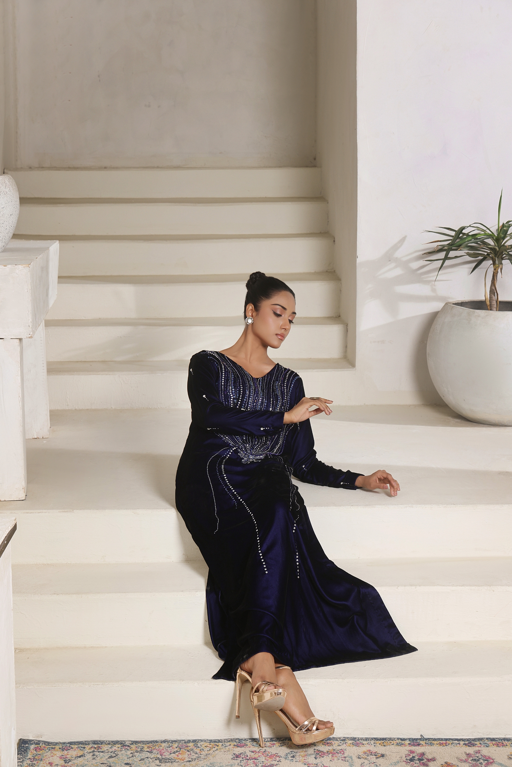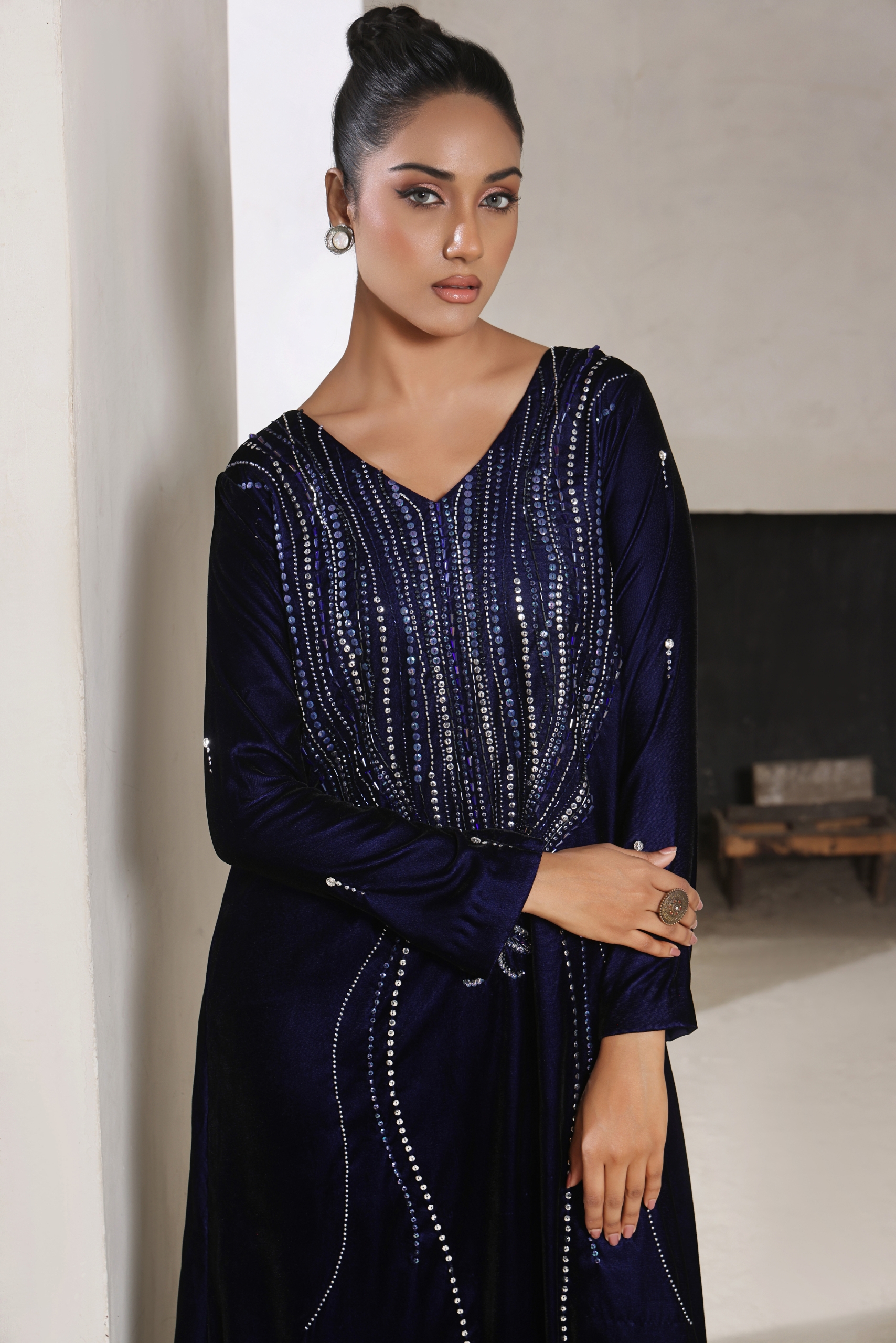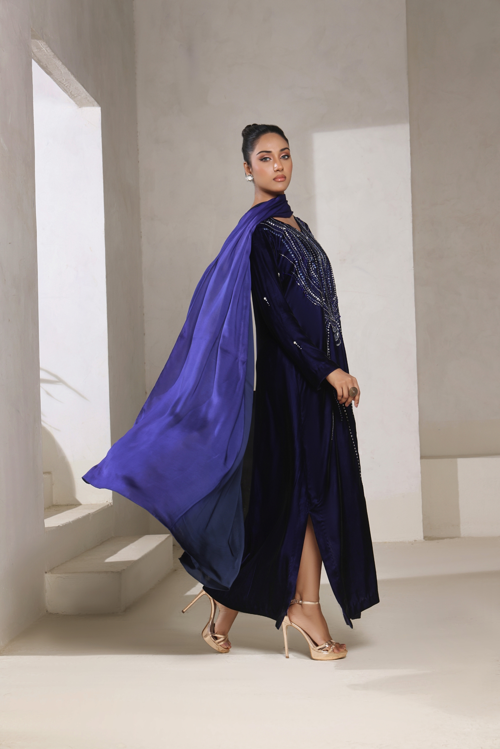 Shaded pure velvet outfit adorned with all-over stone work, offering a rich, luxurious, and elegant winter look.