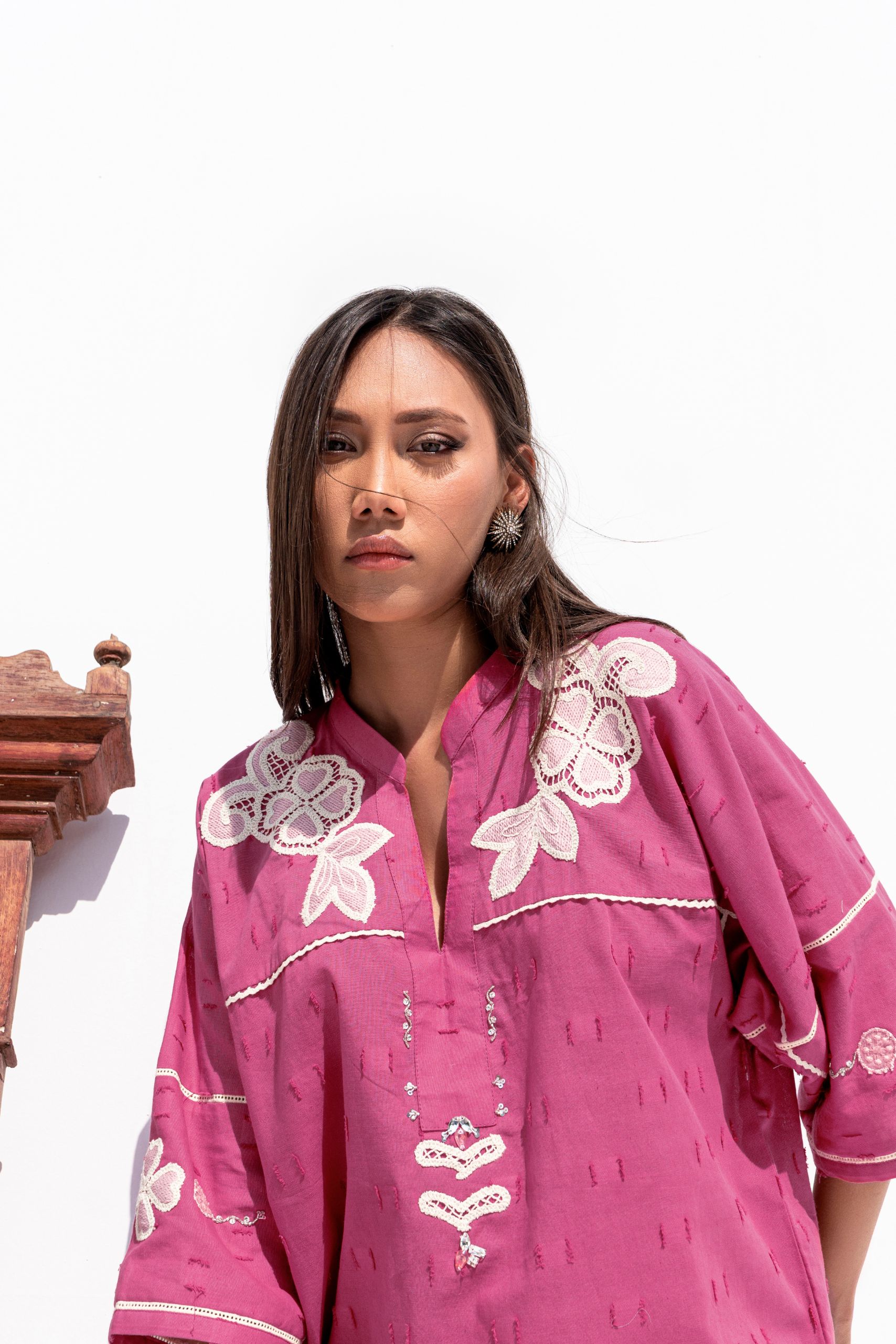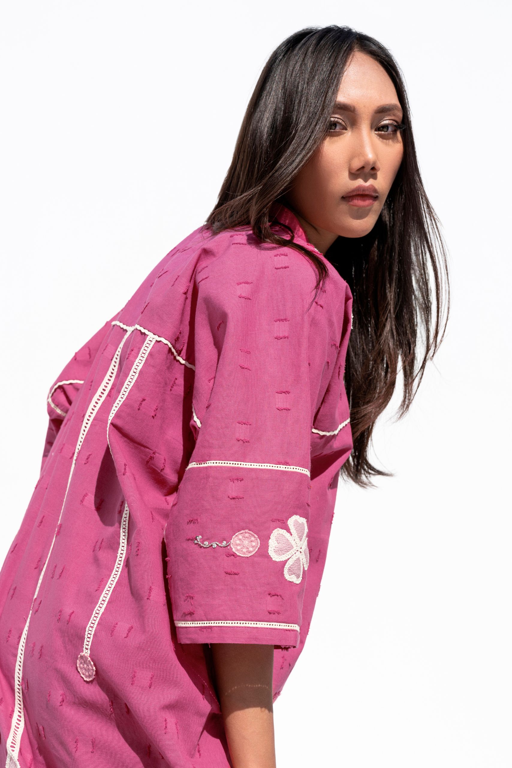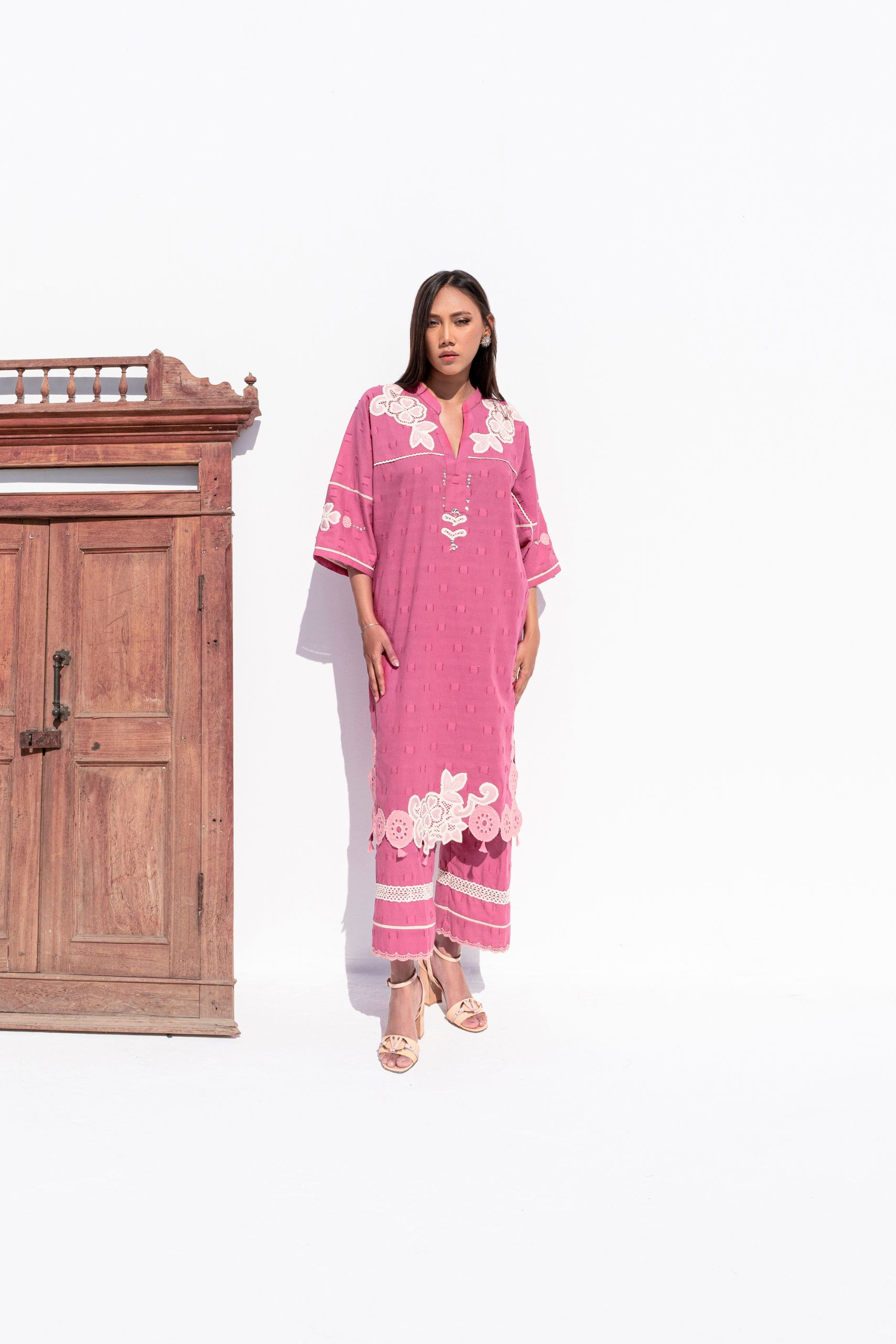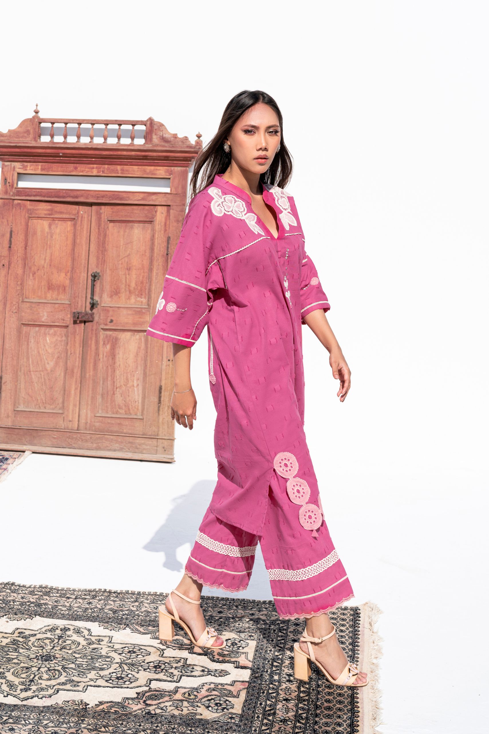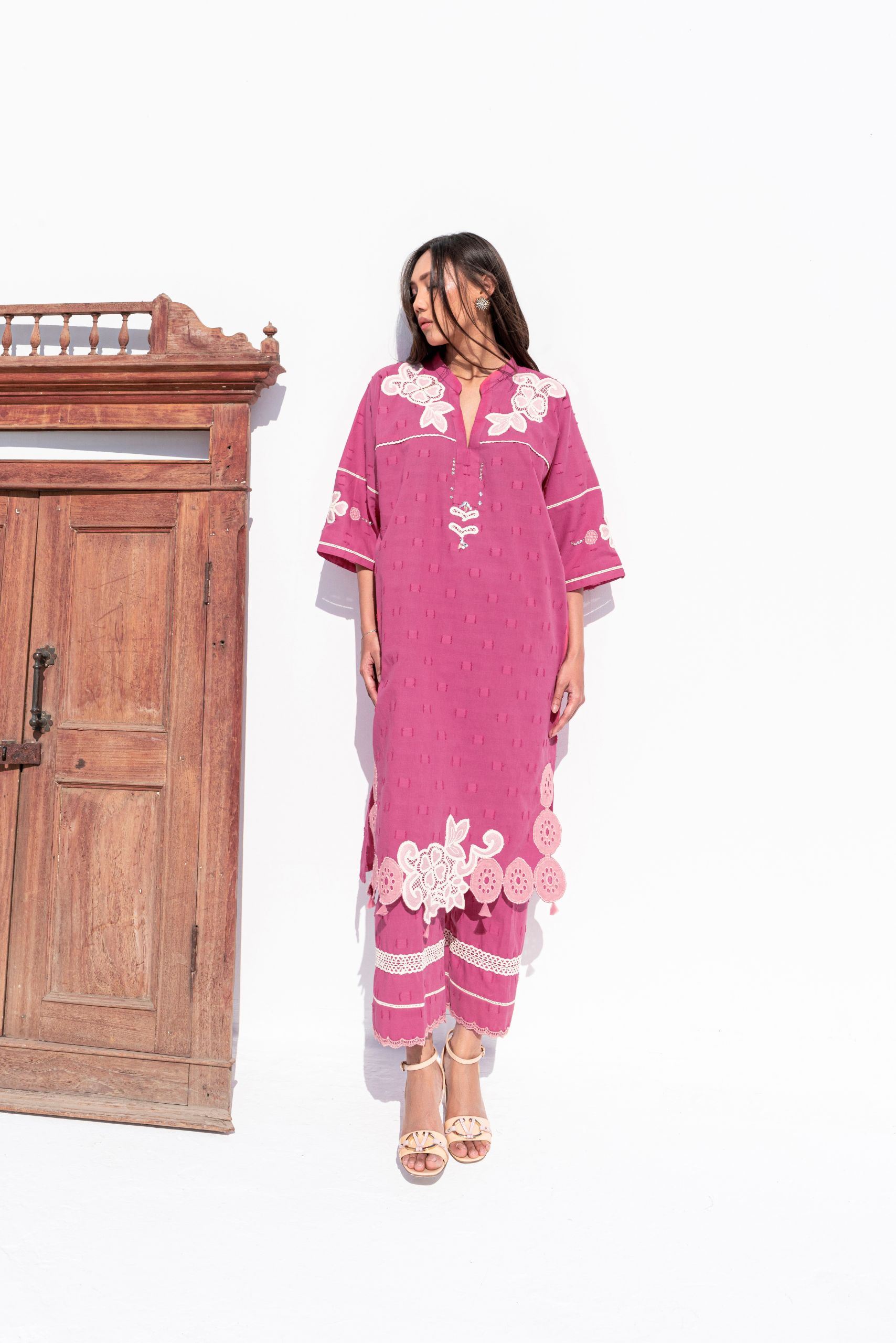 Crafted from textured cotton, the Rosa dress is a refined blend of applique and lacework. The delicate handwork on the neckline adds an elegant touch, making it a perfect choice for festive occasions.