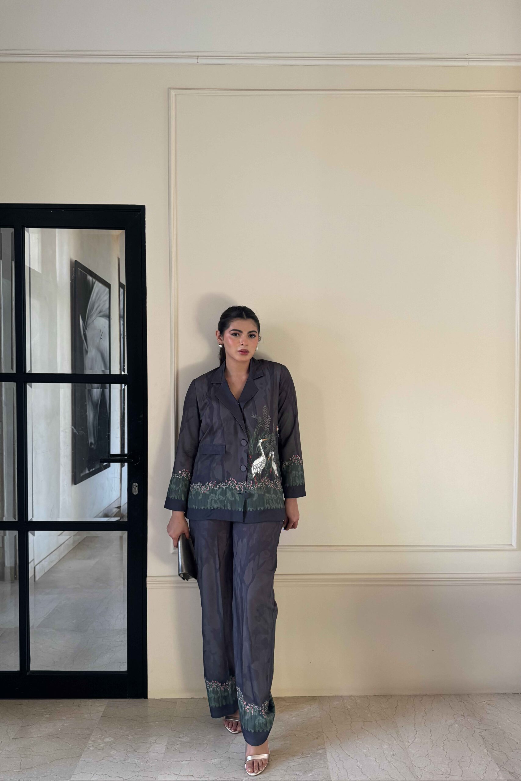Swan is a beautifully crafted, in-house printed blazer designed in crepe silk. The custom print follows current trends, making it a standout piece for any wardrobe. A subtle touch of sequins and stone embellishments on one flap adds just the right amount of sparkle for a refined, fashionable look.