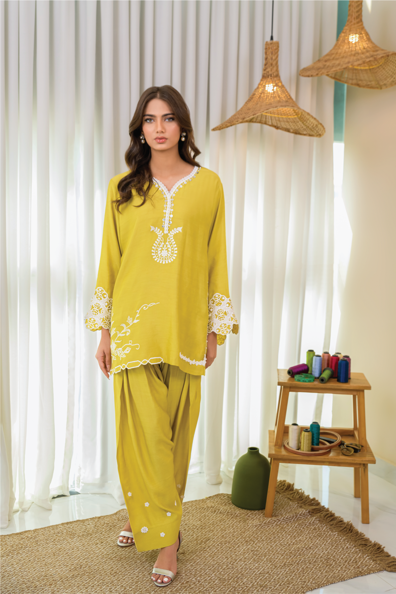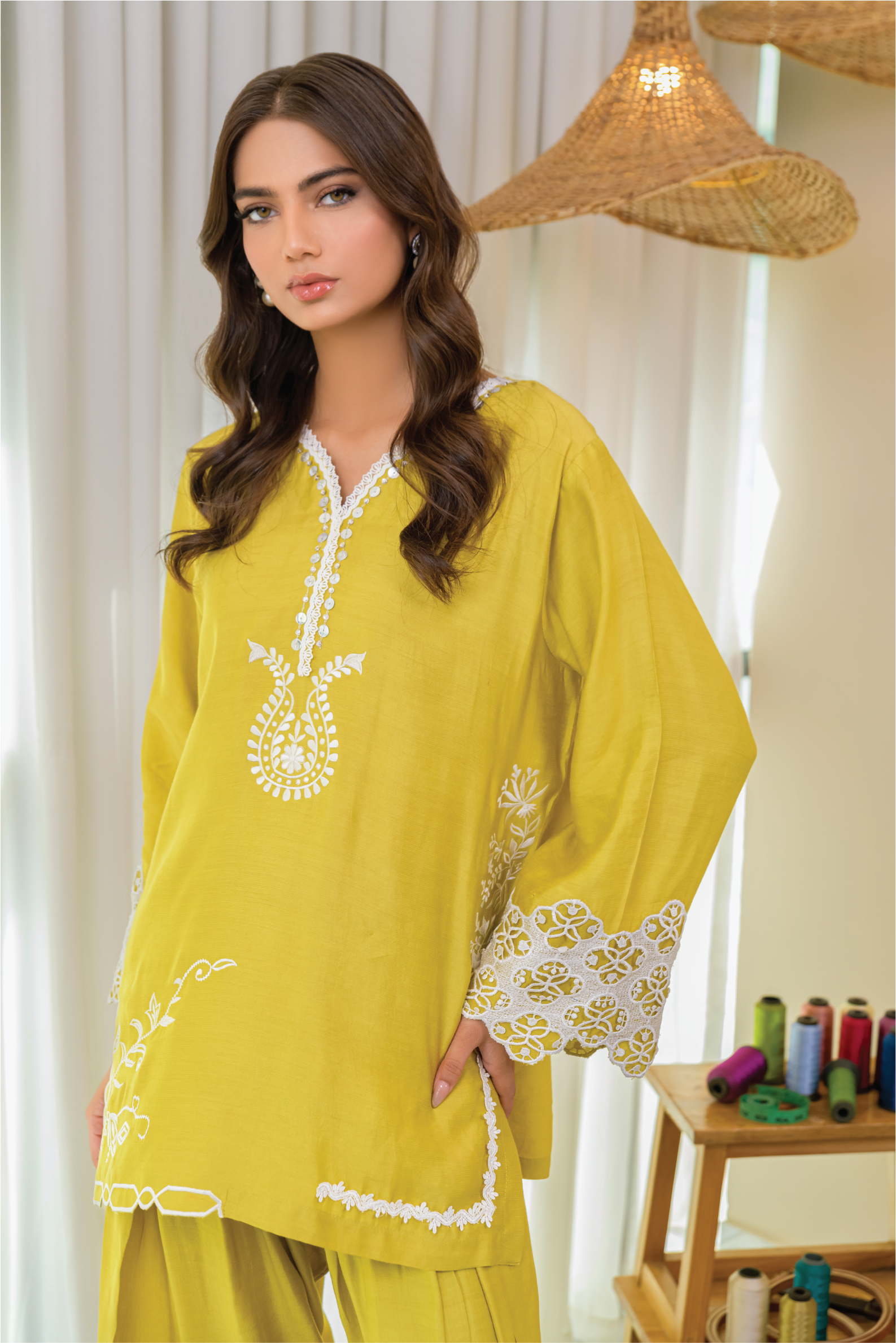 Crafted from premium Khaddi cotton net this outfit showcases delicate embroidery and intricate lace applique work, complemented by a matching shalwar. The accompanying silk dupatta, adorned with lace detailing, adds a luxurious touch,