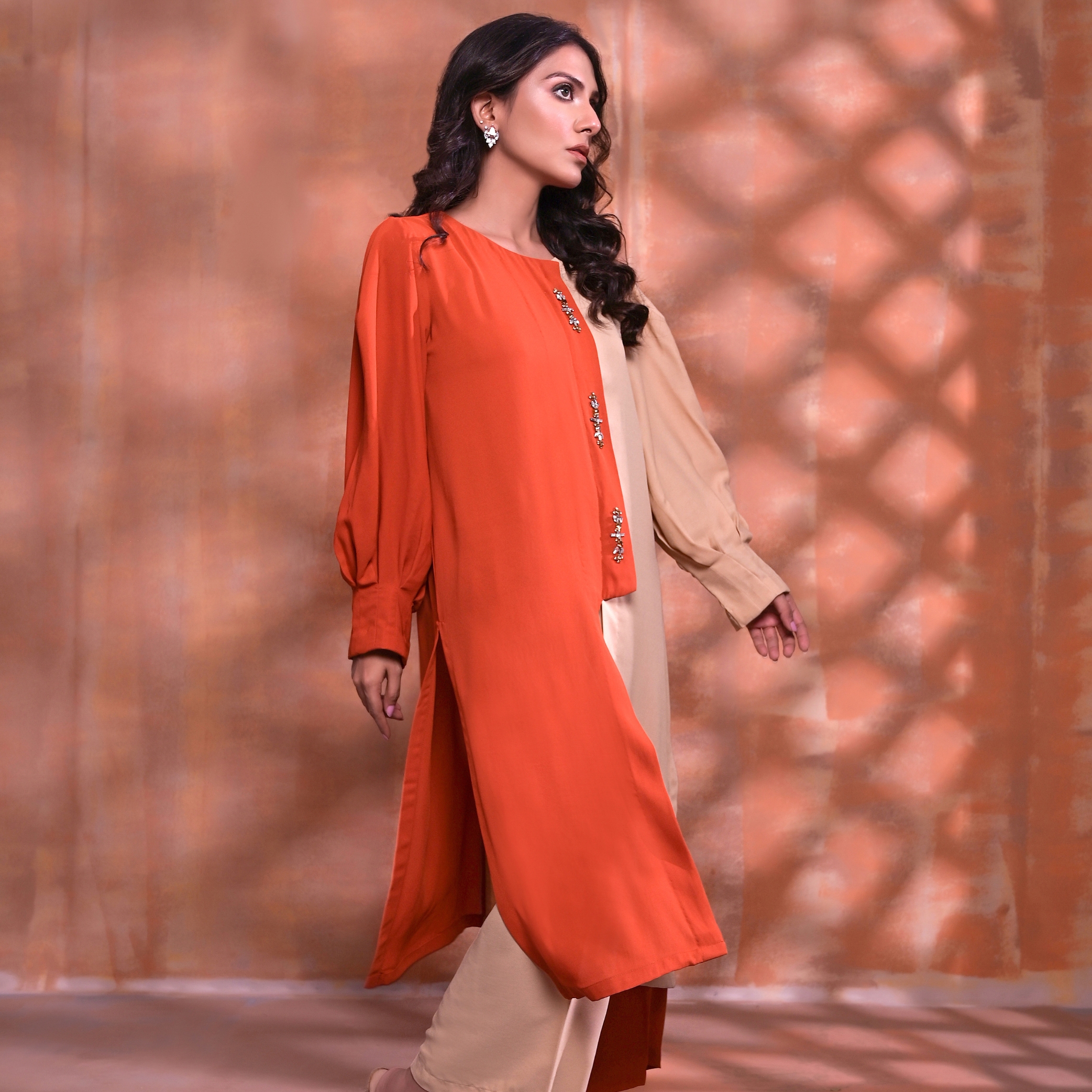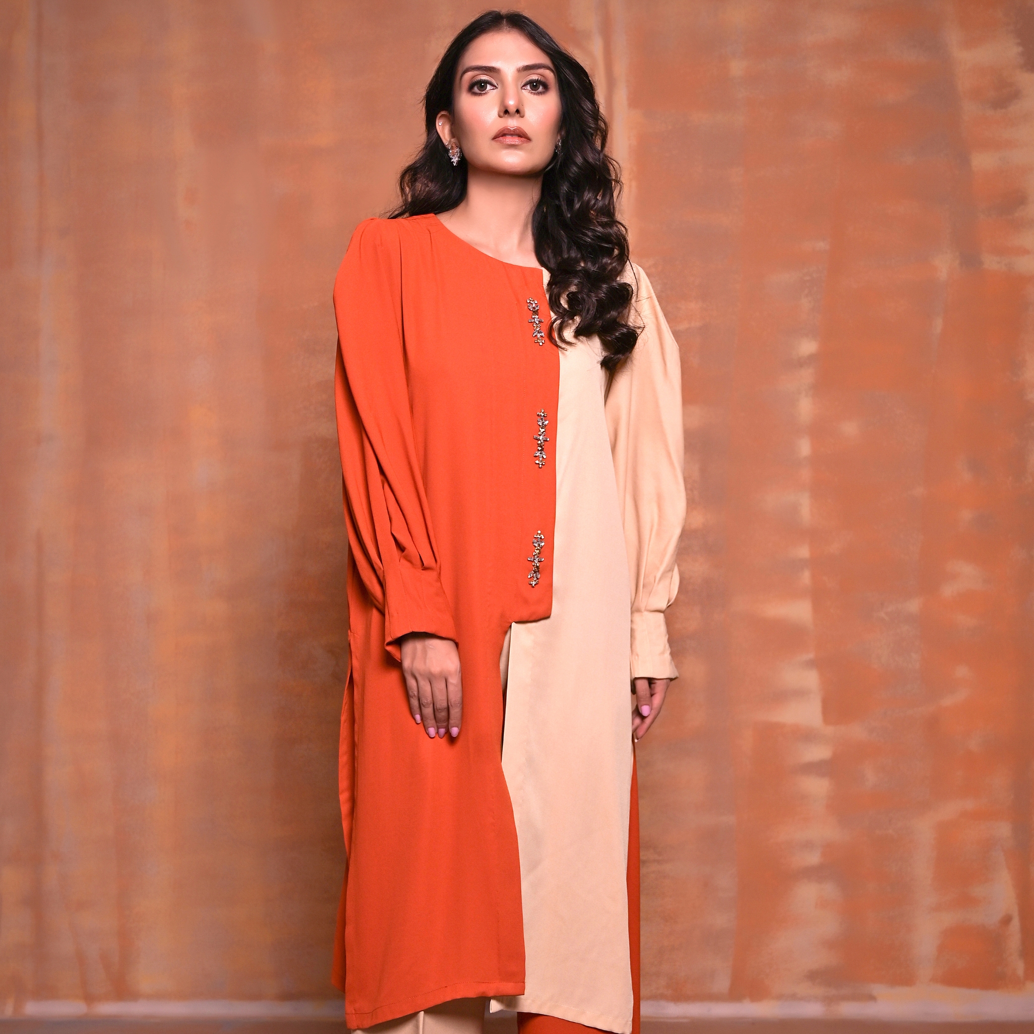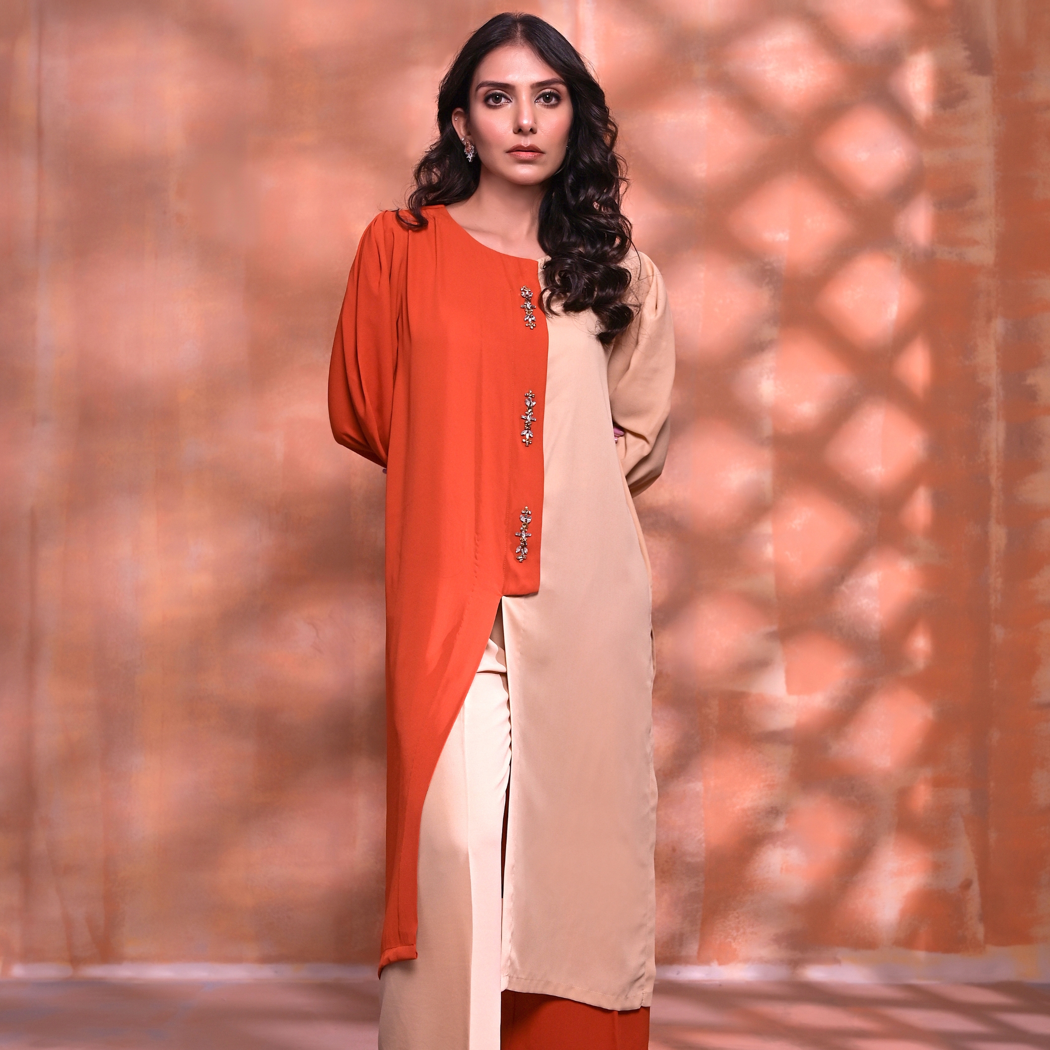 Twain is a Monochromatic look in Georgette embellished with Stone Work on the Frontline to give a Trendy Sophisticated Look.