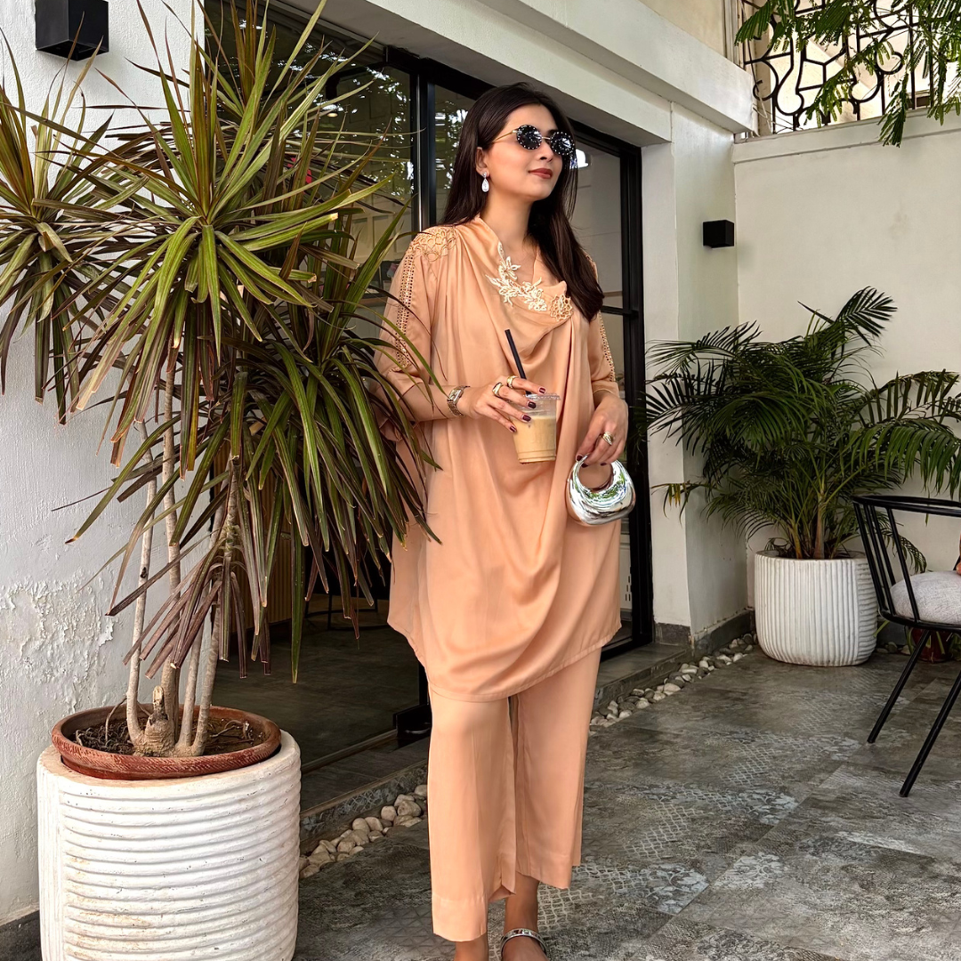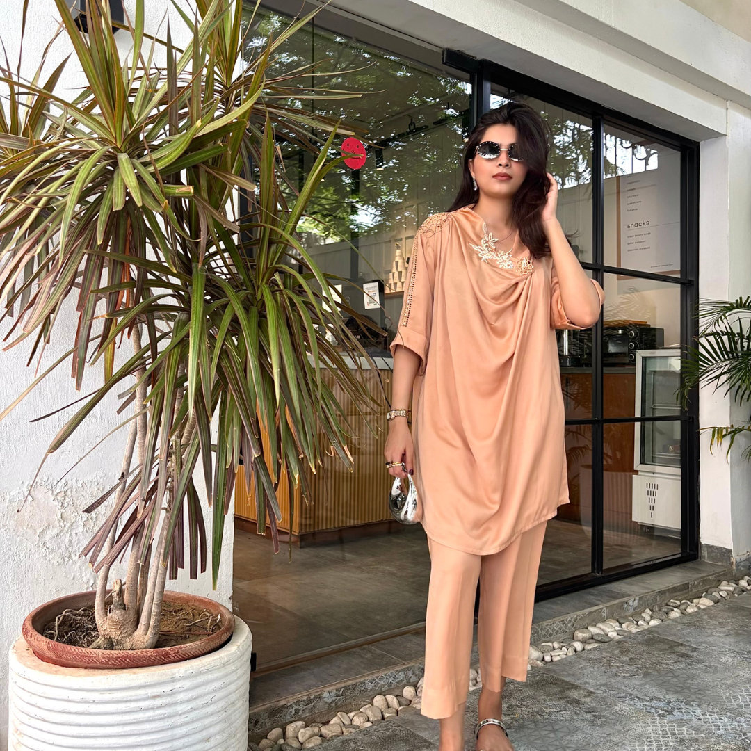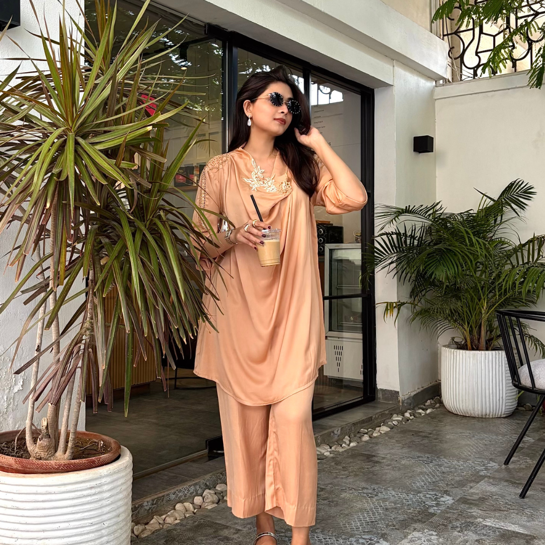 Crafted from luxury cotton silk, this outfit showcases intricate chikankari and handwork on the sleeves, paired with an embroidered appliqué motif on the neckline. A chic, modern cut perfect for evening outings or quick coffee runs, because style never takes a break.