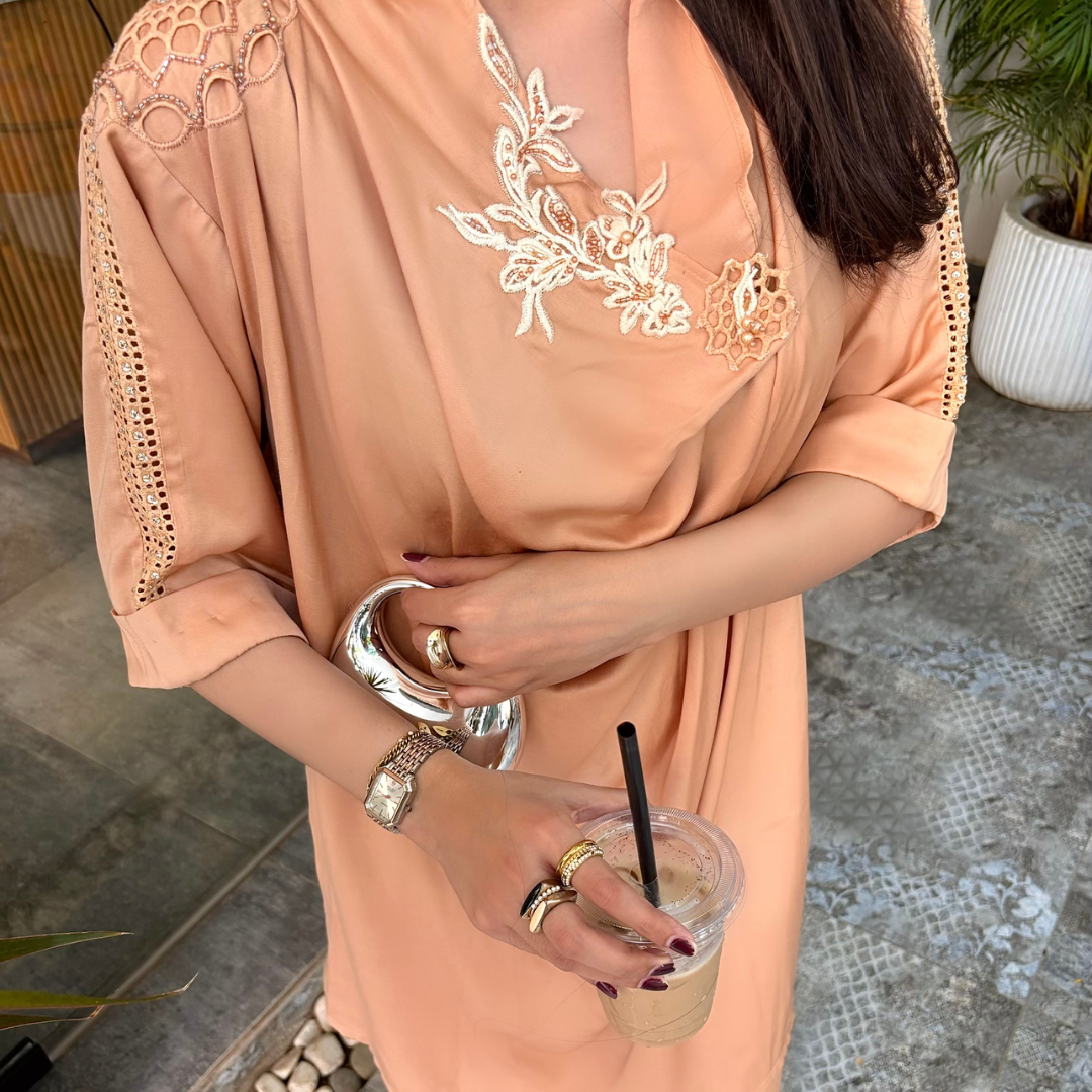 Crafted from luxury cotton silk with chikankari and handwork on the sleeves, and an embroidered appliqué neckline. A chic, modern cut, perfect for evenings or stylish coffee runs.