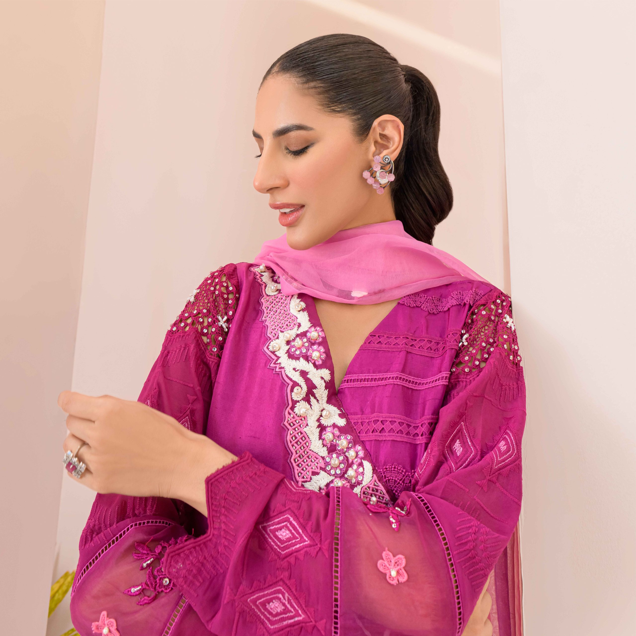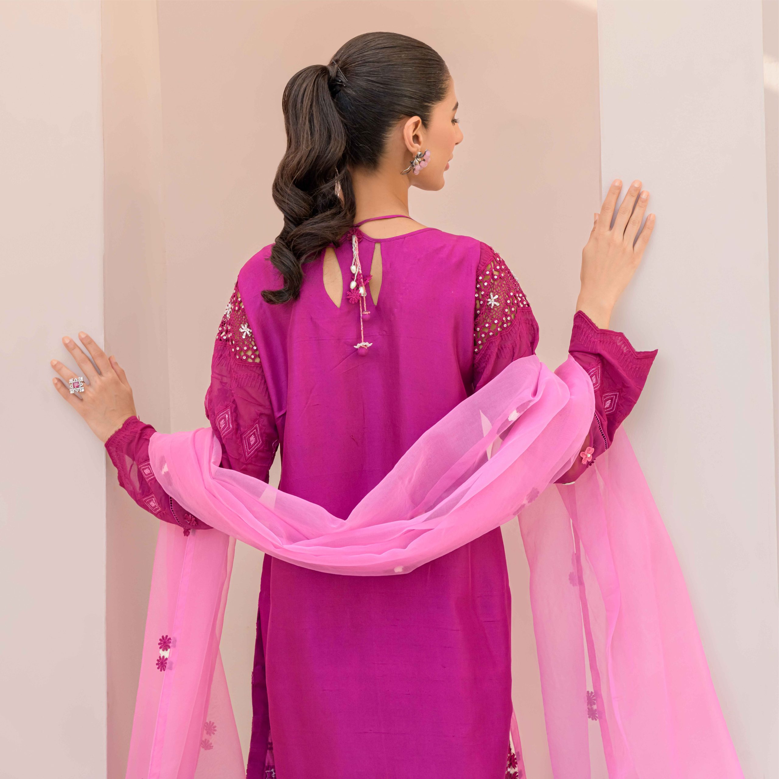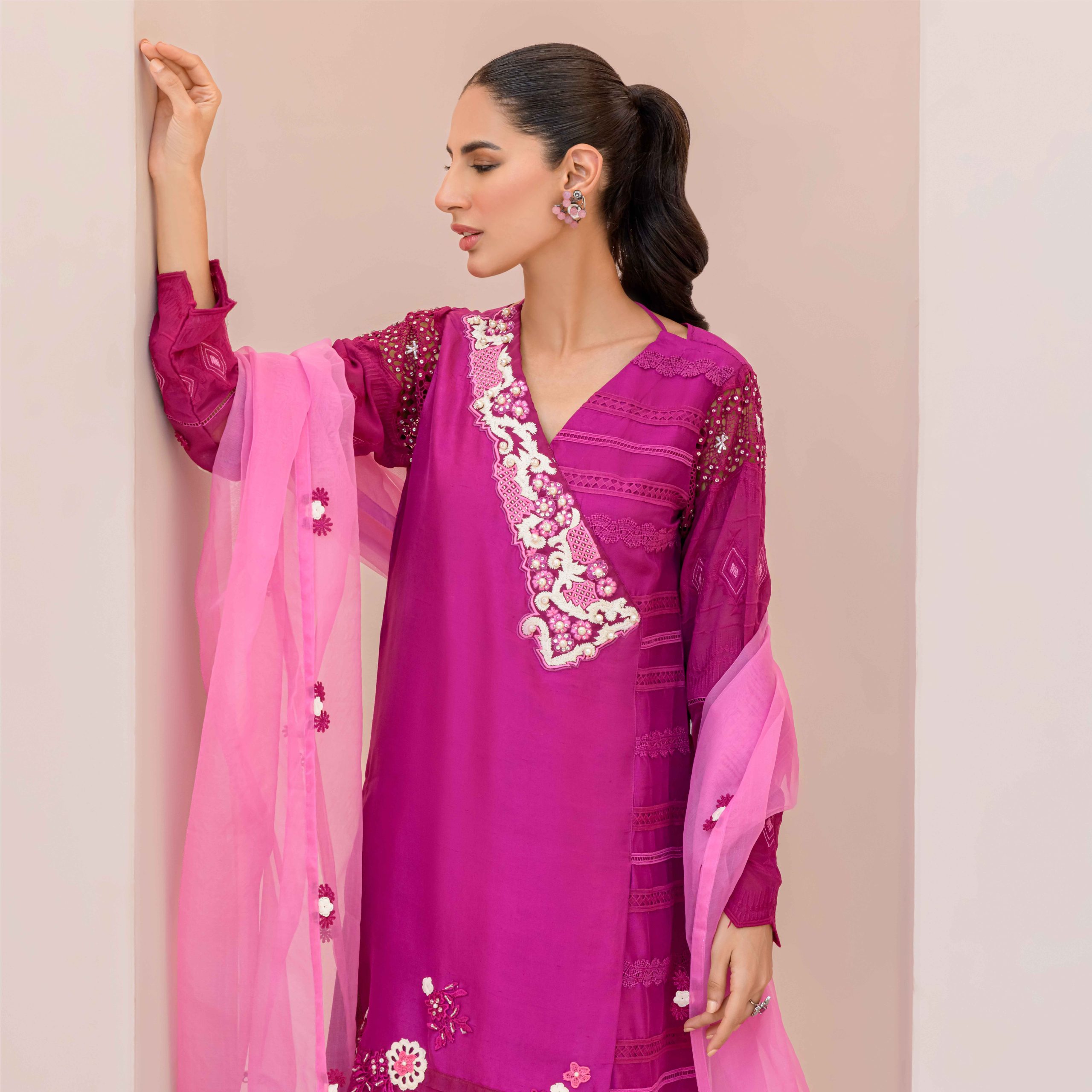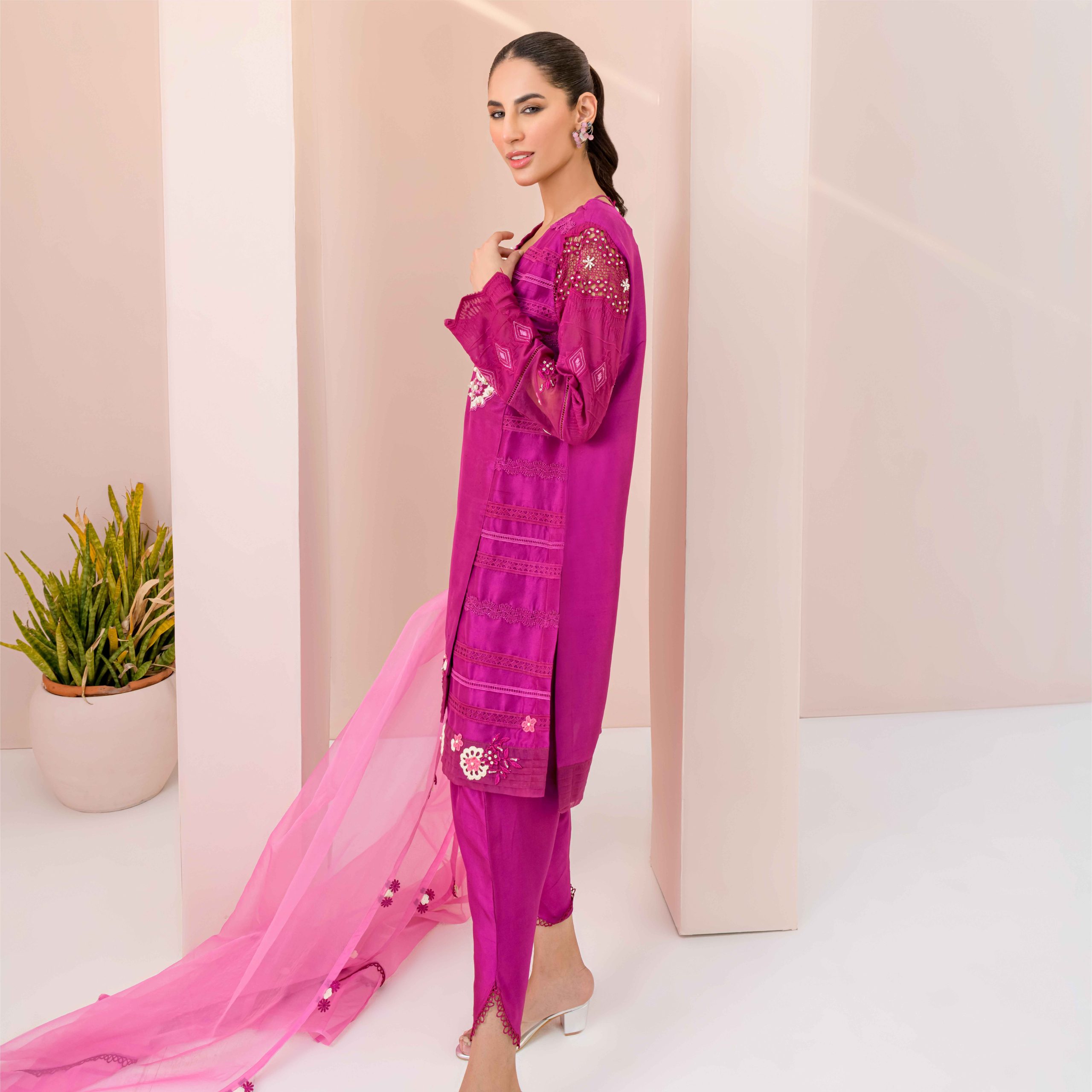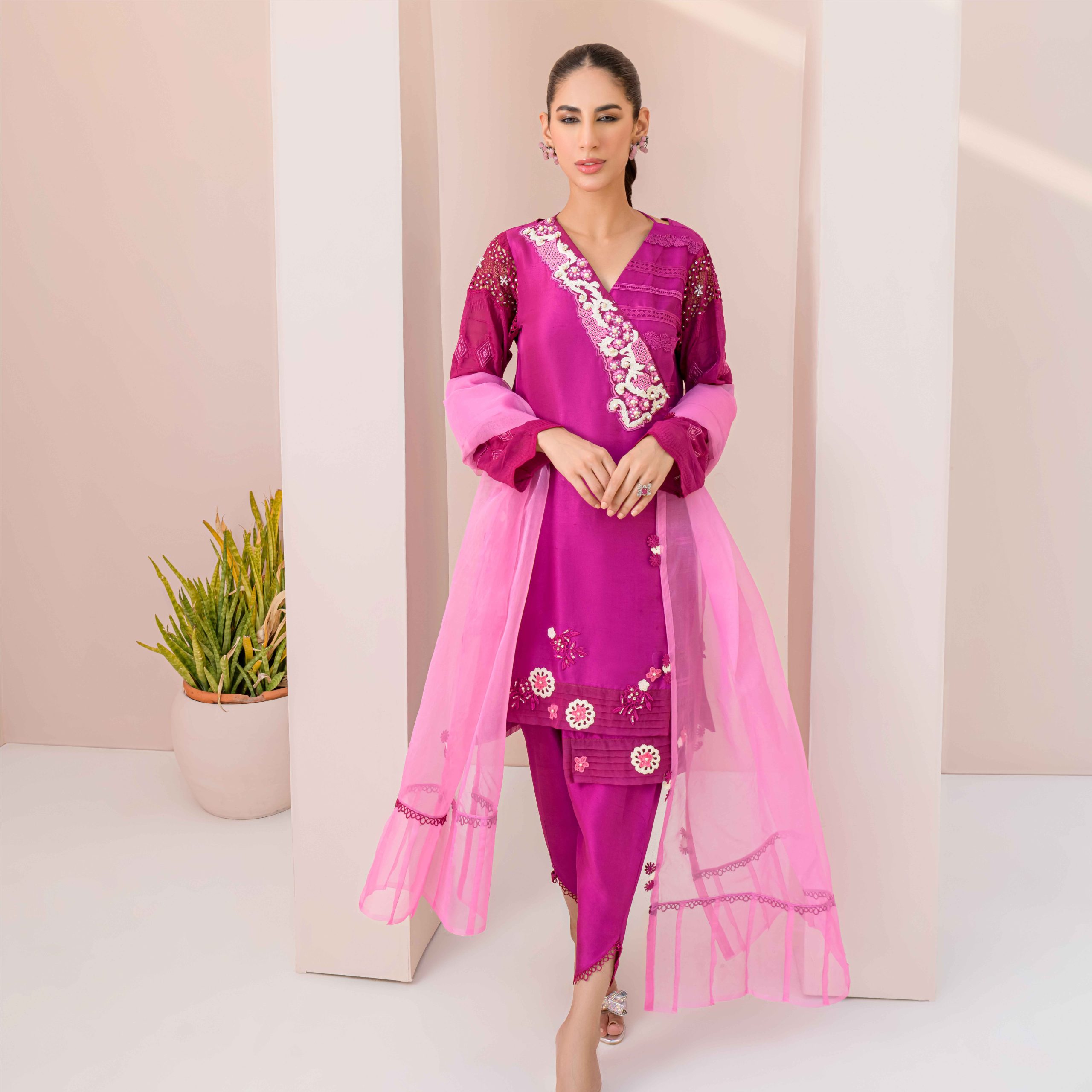 Zayla, made in Pure Rawsilk is a Beautiful piece from our Luxury Pret Collection and is suitable for all kind of Festive Events . The neck is designed with Hand Embroidered Motif. Laces on one side of the Shirt makes it exceptional to wear. It is a Trendy Angarkha style with high and low Daman. The Flowers detailing on the Daman adds more to the overall Charm. The Finishing Touch is given by the Dupatta in Contrast Colour with yet again Detailings of Flowers on it